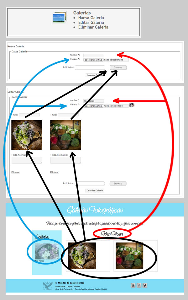 Hemos avanzado muchísimo!! Tenemos los textos personalizados. ¿Vamos con la Galería?: Para empezar haremos Una nueva Galería que luego podrás volver a editar o eliminar. Debes saber que puedes abrir tantas galerías nuevas como quieras pero tendrás que identificarlas con una imagen de cabecera que contendrá todos las fotos que la añadas. Es muy sencillo. Mira este esquema y … A por ellas!