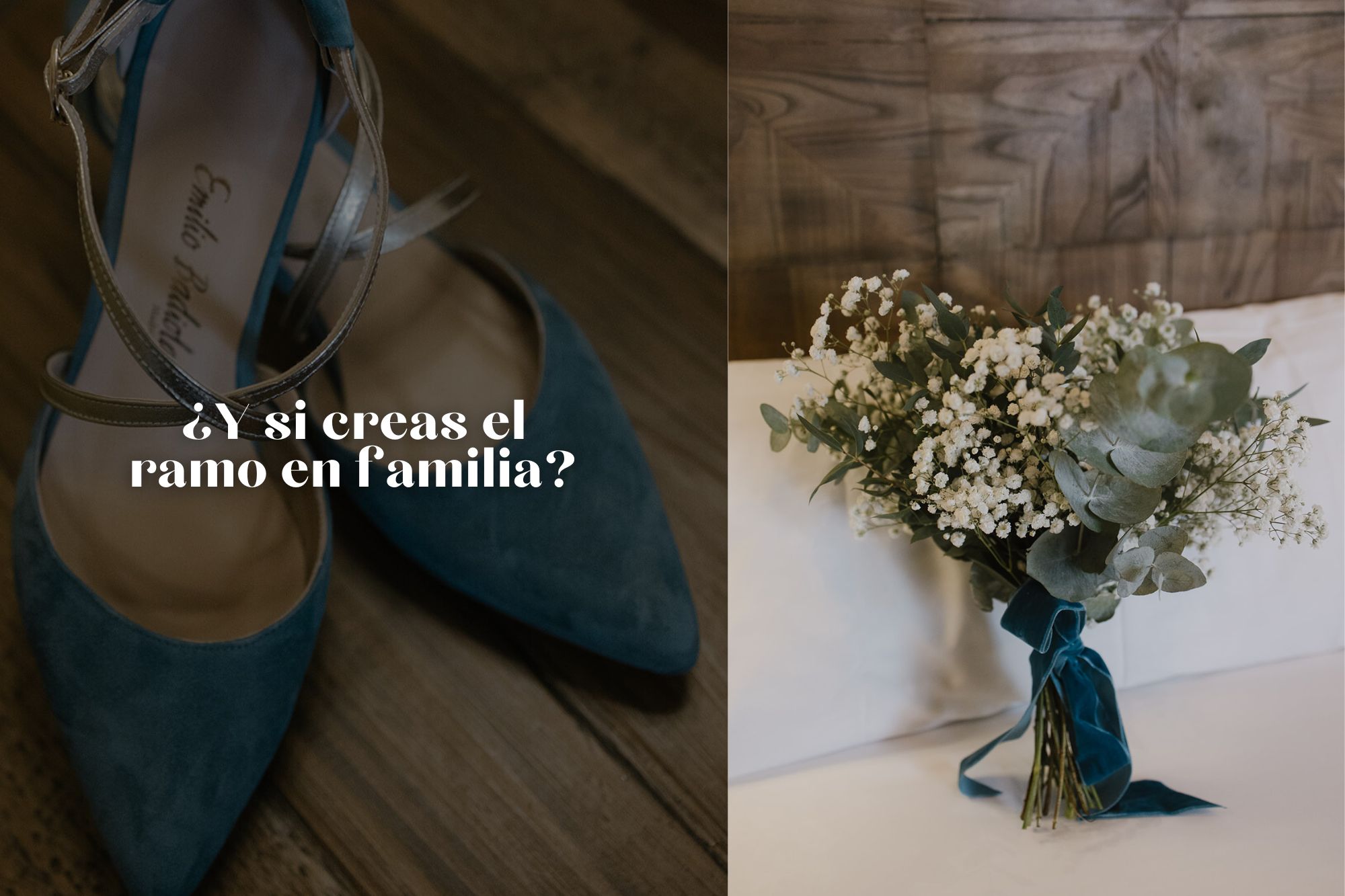 En algunas floristerías ofrecen talleres para crear tu ramo en familia. Nos contaba que la florista le preguntó cuál era su idea sobre el ramo, ella le dijo que quería un ramo sencillo de flores pequeñitas, con blanco, verde, y que le  quería poner una cinta turquesa porque así eran sus zapatos.